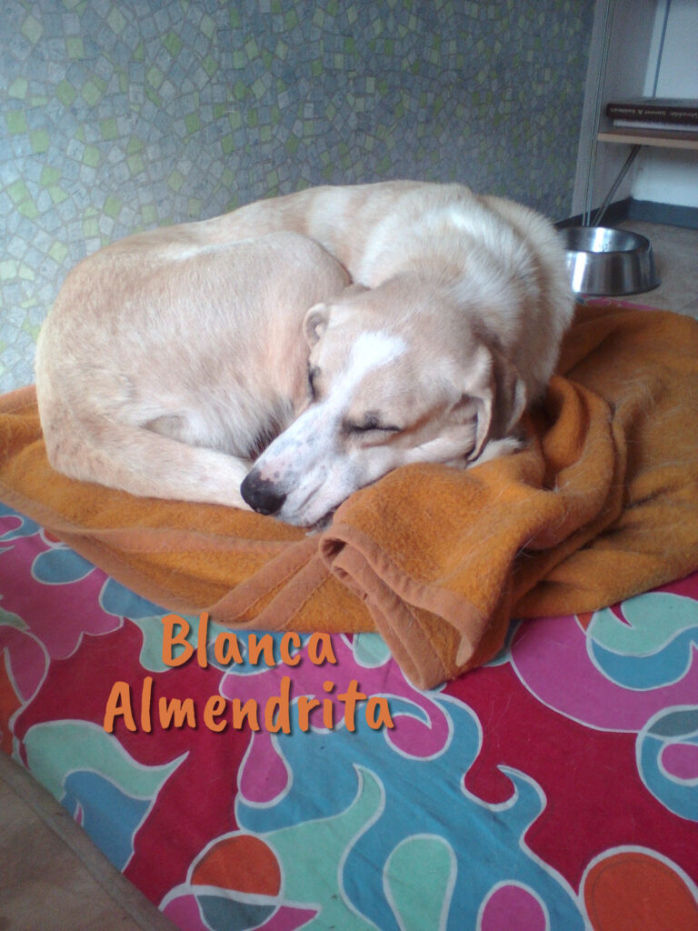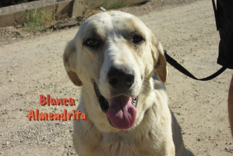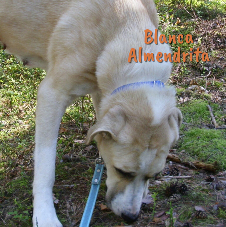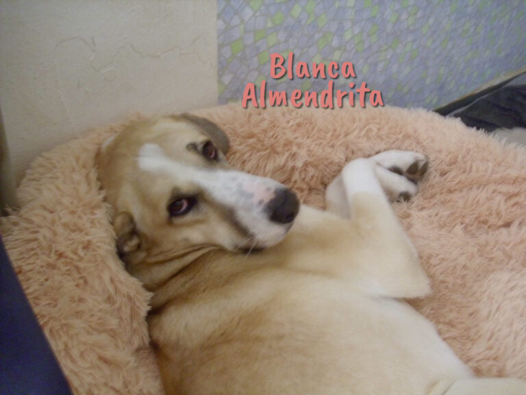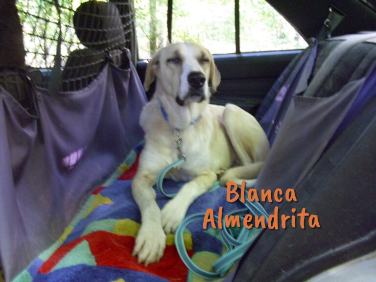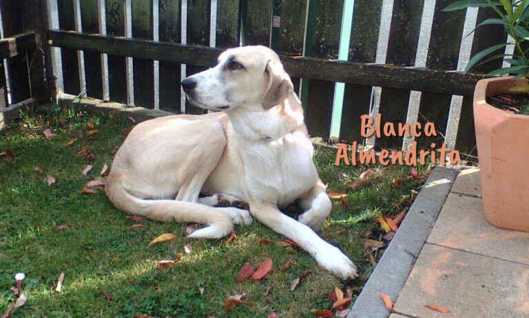 Blanca Almendrita wurde von einem jungen Mann auf der Straße gefunden. Sie war sehr geschwächt, er fütterte sie und gab ihr zu trinken. Er rief auch die Polizei, aber als er merkte, dass sich keiner kümmerte, bat er Alicia um Hilfe. So durfte Blanca Almendrita ins Shelter ziehen, wo sie sich als wahrer Schatz entpuppte. Diese schöne Hündin strahlt Ruhe, Gelassenheit und Liebe aus. Sie versteht sich mit allen Hunden und sowohl Menschen als auch Katzen mag sie sehr gern.