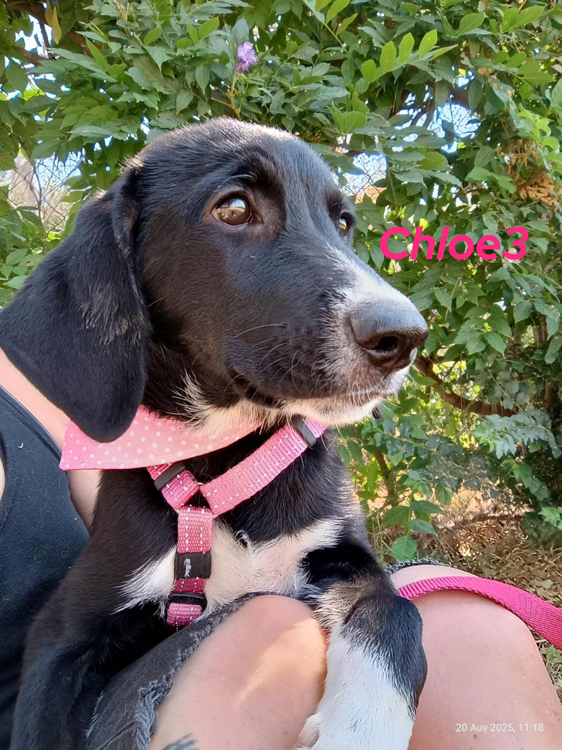 Die junge Hündin ist sehr sozial, spielt und erkundet mit Begeisterung ihre Umgebung. Unter den Welpen zeigt sie sich selbstbewusst und unerschrocken, doch erwachsene Hunde respektiert sie. Chloe ist klug, lernt schnell und läuft bereits an der Leine.