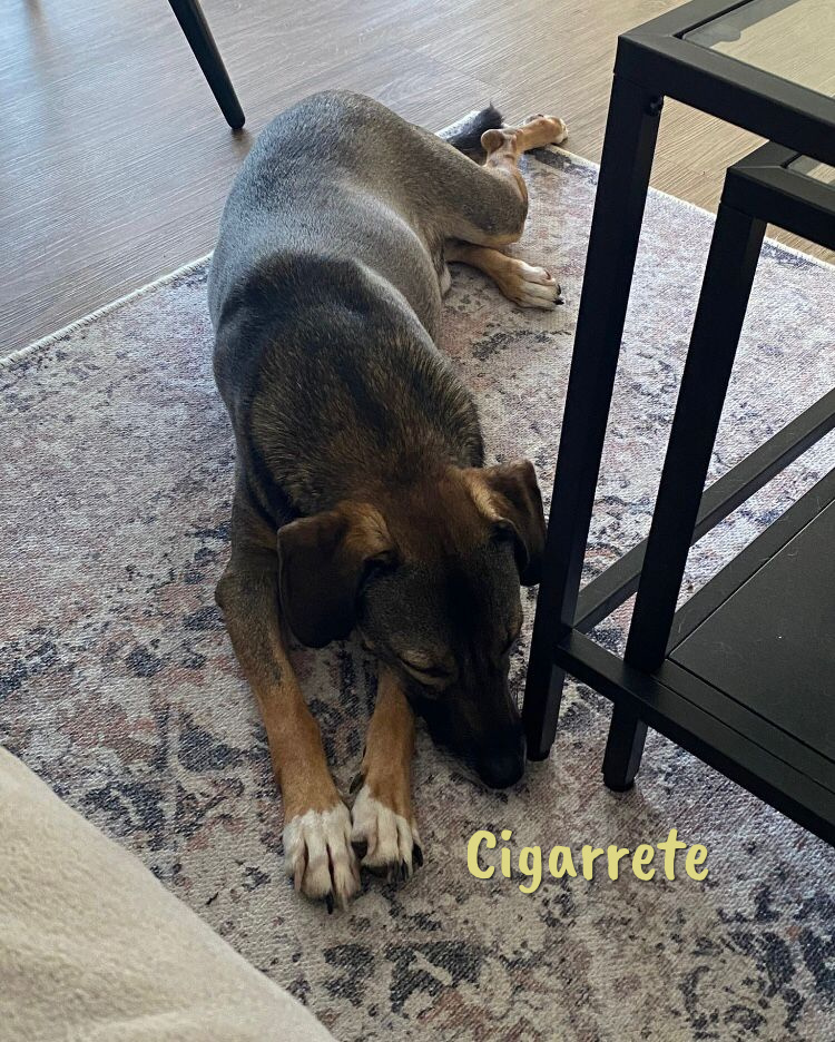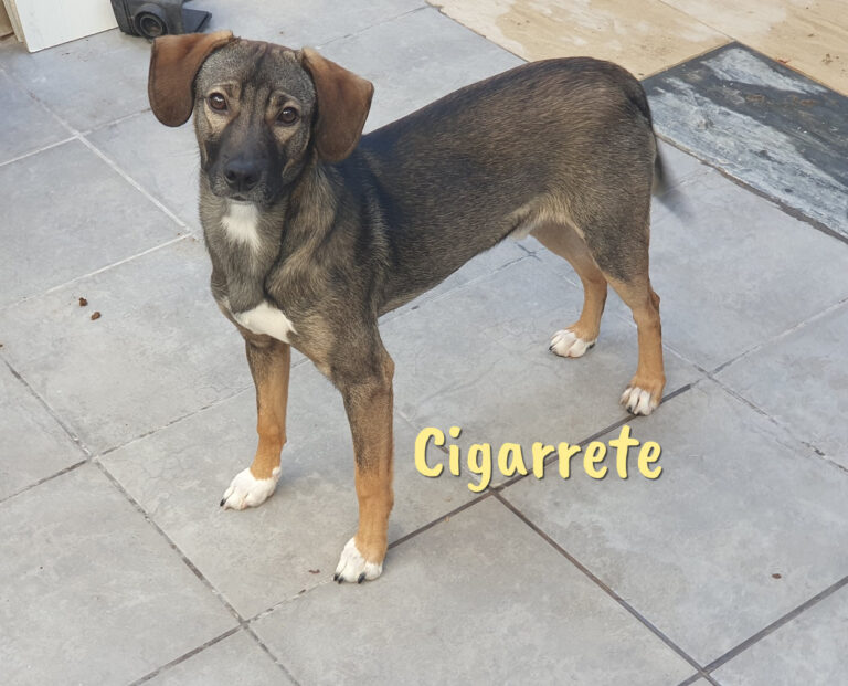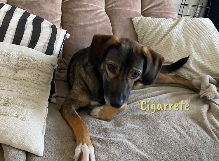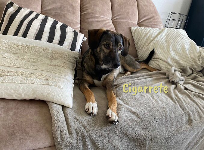 Cigarrete gehörte einem Nachbarn von Alicia, der ihr den Hund überließ mit der Aussage, er sei sehr ängstlich und ließe sich nicht fangen, weil er Angst vor dem Zeckenschutzspray hätte. Alicia nahm Cigarrete auf und ließ ihn zwei Monate bei sich zuhause leben. Am Anfang war der hübsche Hund tatsächlich skeptisch Menschen gegenüber und besonders auffällig war, dass er sich zu verstecken versuchte, wenn er seinen Name hörte.