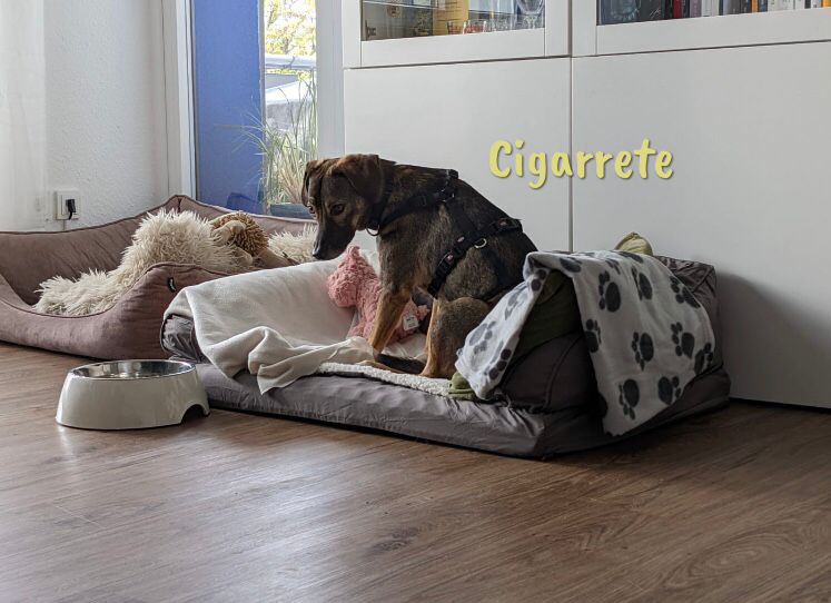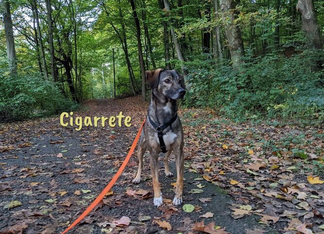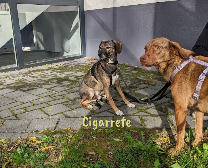 Cigarrete, der auf seiner Pflegestelle Yago genannt wird, ist ein wunderschöner, sehr neugieriger und sanftmütiger Rüde. Am Anfang noch sehr schüchtern, macht er nun in der kurzen Zeit von einer Woche bereits schnell Fortschritte: er lässt sich gerne streicheln und genießt das Bauch-Kraueln auf der Couch, spielt gerne und verträgt sich super mit der vorhandenen Hündin, wobei er auch mit anderen Hunden keinerlei Probleme hat. Außerdem ist Cigarrete bereits stubenrein. Fremden Menschen, sowie auch Hunden begegnet er kurz etwas zurückhaltend, taut dann aber schnell auf und sorgt rasch für ein Lächeln auf den Lippen. Hat man sein Vertrauen gewonnen, meistert er sogar das gruselige Krallenschneiden mit Bravour. Auch das Spazierengehen klappt schon gut: er ist stets mit kurzen Blicken am Menschen orientiert und läuft bereits gut an der Leine, wobei er durch das stetige Training mit der Leine immer mehr Fortschritte macht. Cigarrete ist ein großer „Schnüffler“ und erkundet seine Umgebung gerne ausgiebig mit der Nase. Sicher hätte er hier große Freude an weiterführendem Training. Sein kluges Köpfchen lässt sich bei dem Käseliebhaber am Besten durch ein Stückchen Gouda herauskitzeln und er wird langsam an die Grundkommandos herangeführt. Alltagsgeräusche sind für ihn kein Problem, egal ob die Nachbarin im Hausflur langläuft oder die Baustelle gegenüber laut ist. Auch das kurze Alleinebleiben nimmt er in Kauf, wenn er danach umso ausgiebiger gekuschelt wird. Für lange und tolle Naturspaziergänge lässt er auch eine blöde, stressige Autofahrt tapfer über sich ergehen. Mit jedem Tag bewältigt er aber auch diese „Aufgabe“ immer besser.