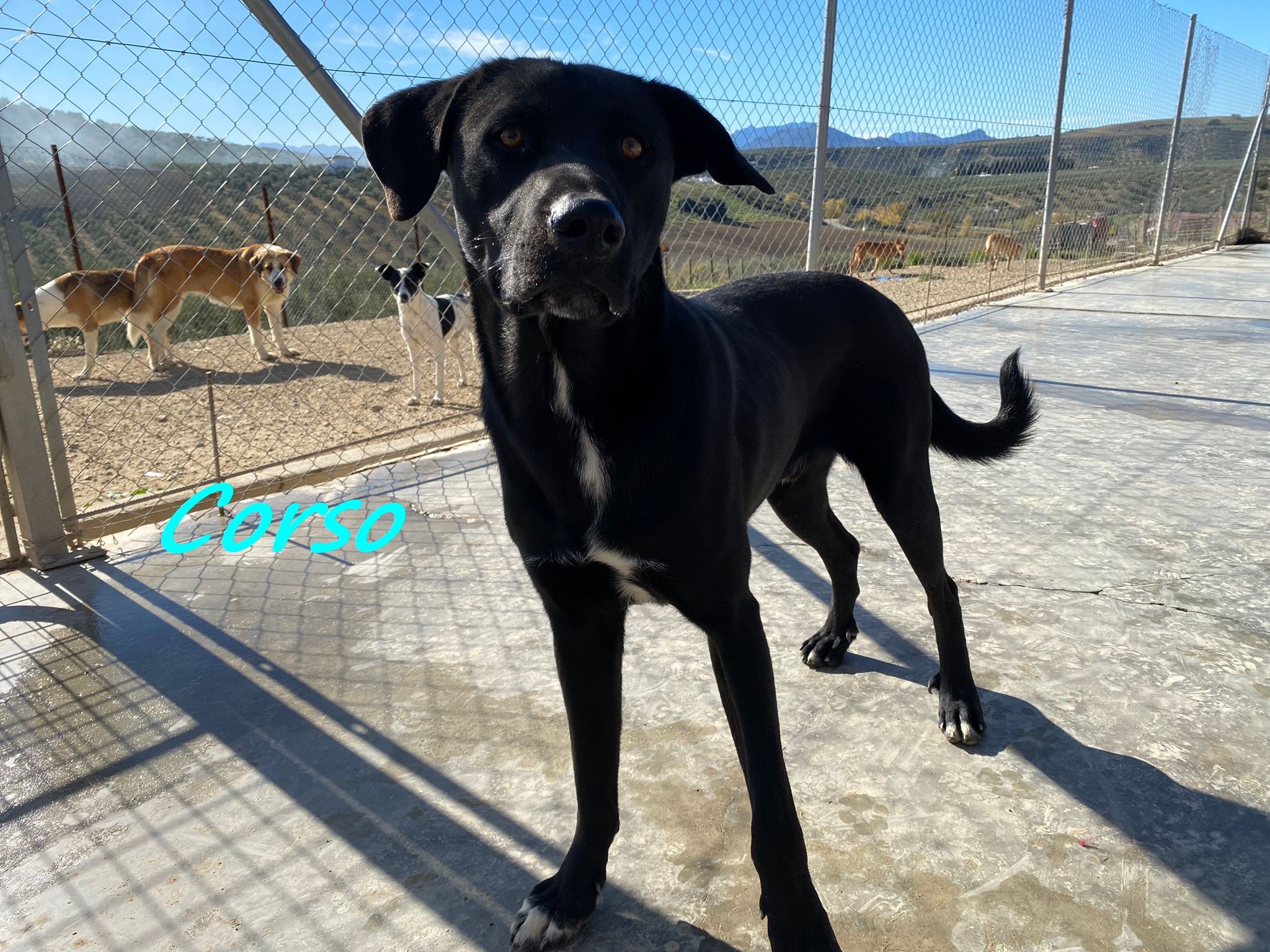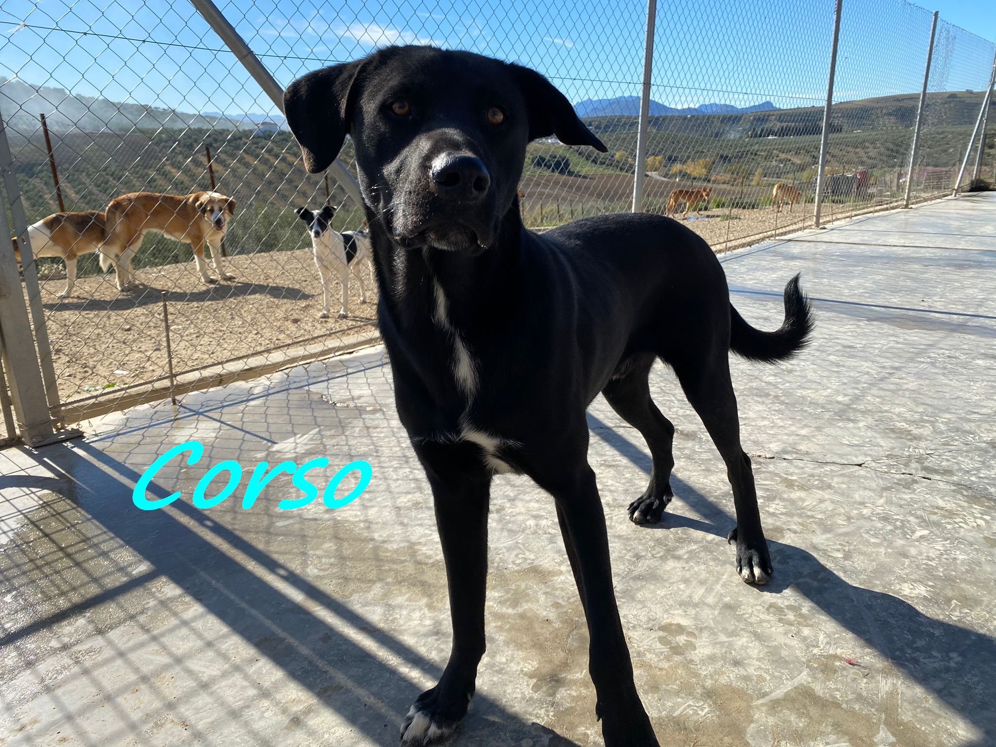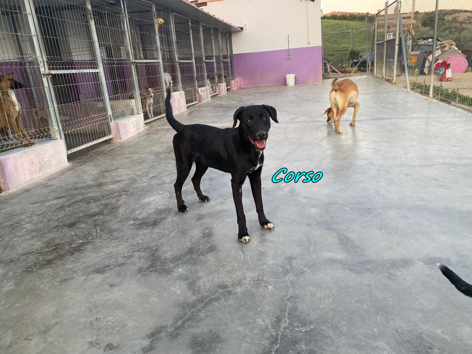 Corso ist sehr zutraulich und mag es geknuddelt zu werden und zu spielen. Er ist mit den anderen Hunden sehr verträglich, und könnte daher sehr gerne zu einem Ersthund. Neben einem Spielkameraden, könnte ein Ersthund ihm auch durch Orientierung und Sicherheit beim Meistern eines neuen Alltags helfen. Das Refugio hat er nur ein paar Mal verlassen und das Fahren im Auto sowie der Besuch beim Tierarzt verunsicherten ihn sehr.