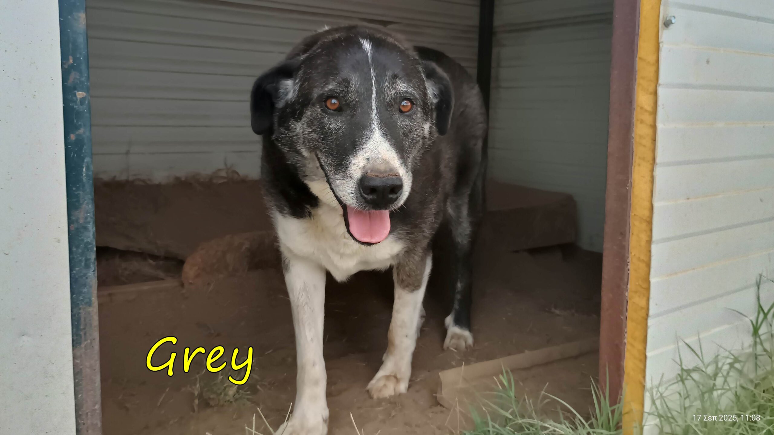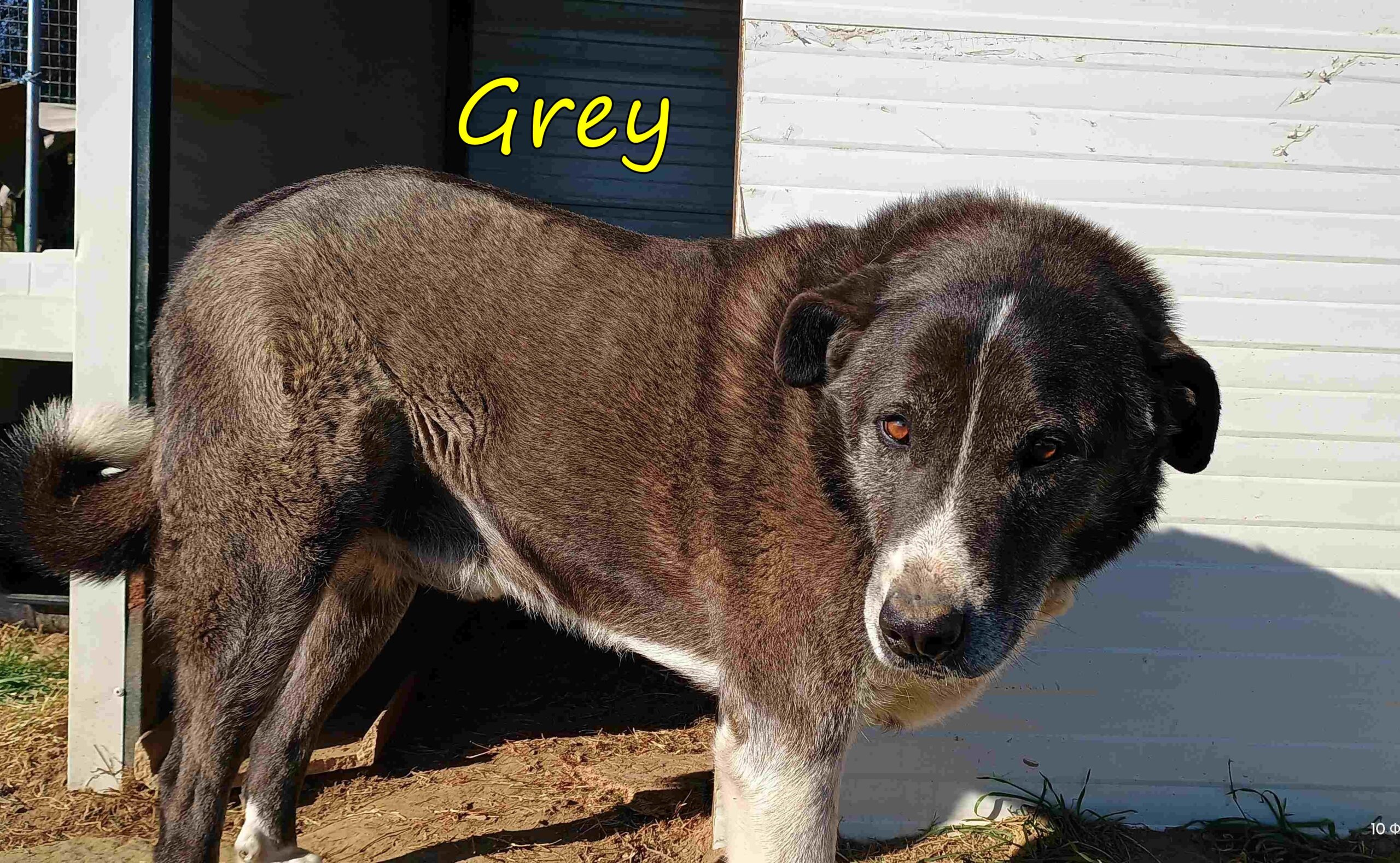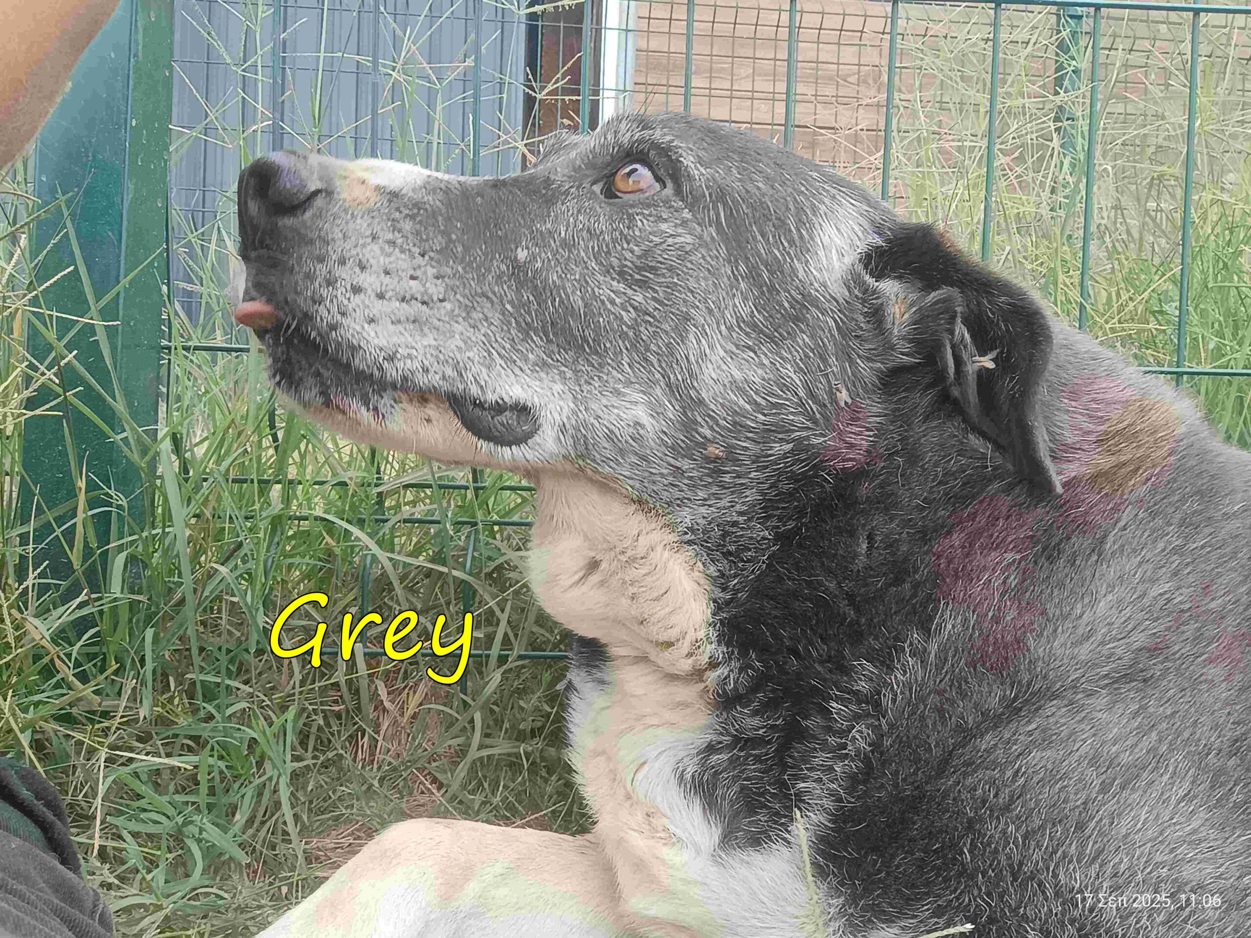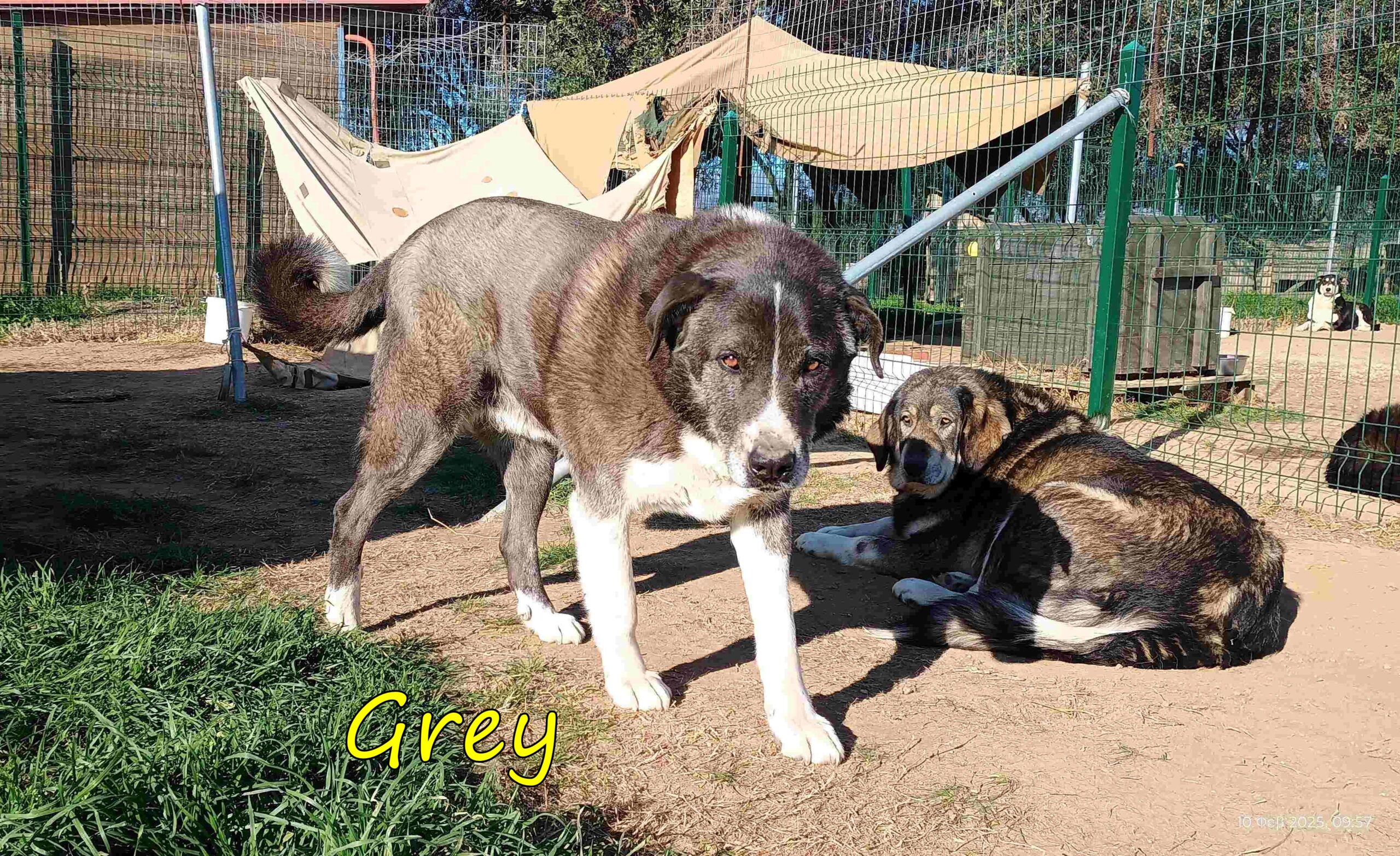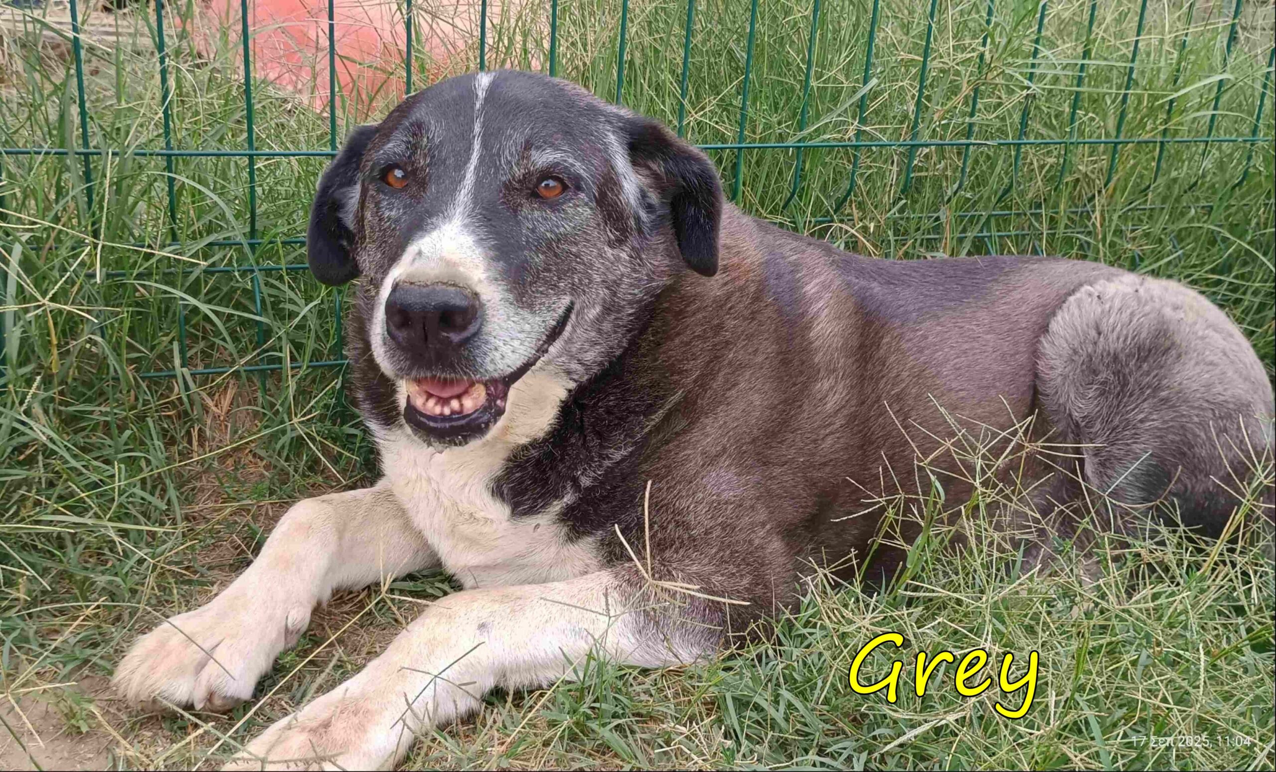 Grey kommt nicht von selbst auf dich zu, doch wenn man sich ruhig neben ihn setzt, bleibt er entspannt und genießt leise Worte und sanfte Streicheleinheiten. Er lebt harmonisch mit anderen großen, erwachsenen Hunden zusammen. Spielen sehen wir ihn zwar selten, doch das friedliche Zusammenleben funktioniert wunderbar.