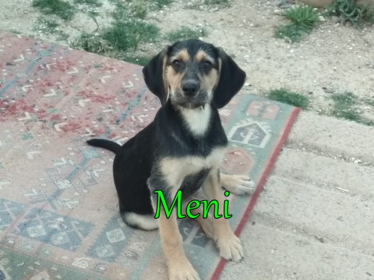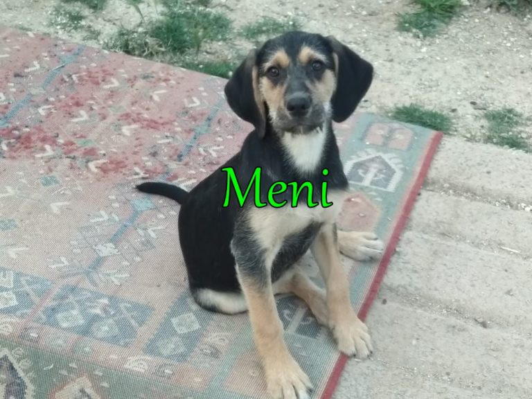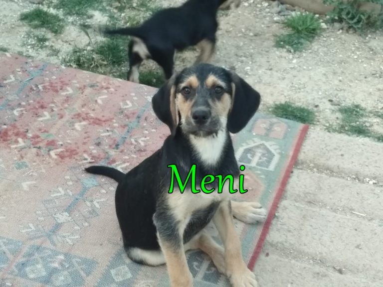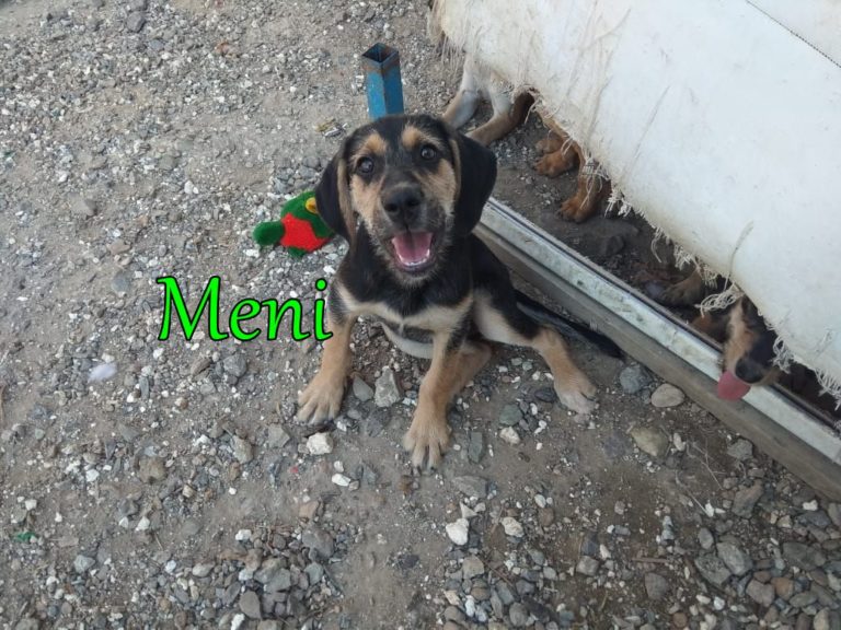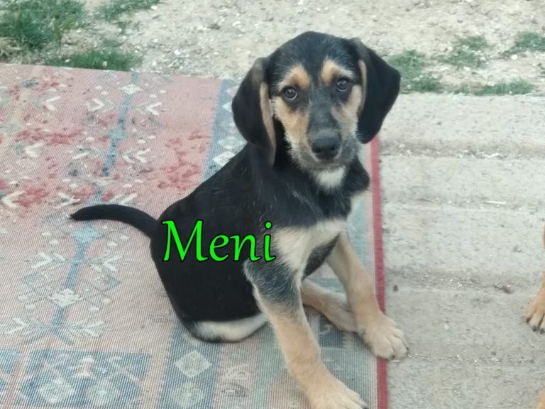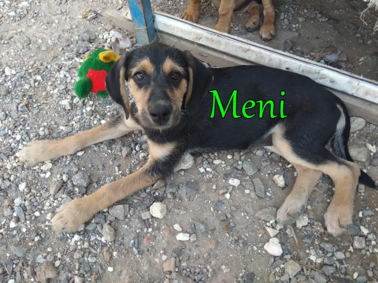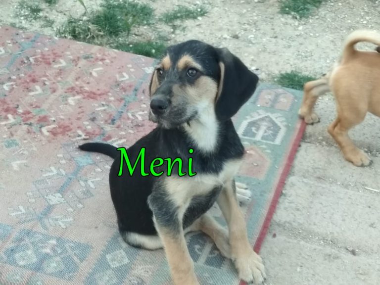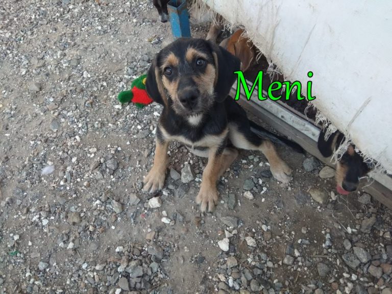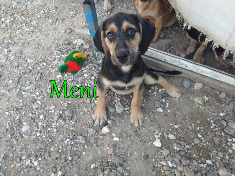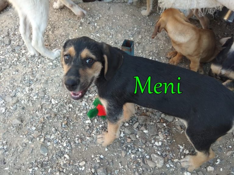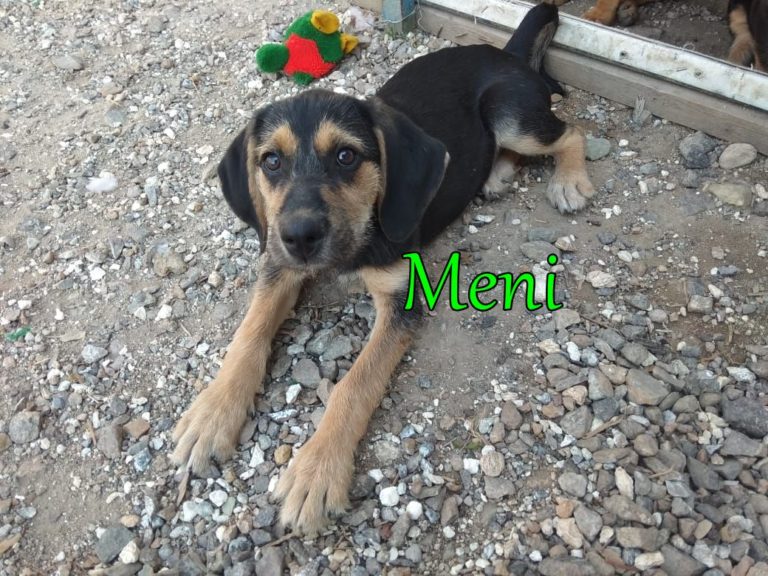 Meni und ihre 3 Schwestern (Moka, Mini und Malu) wurden ausgesetzt. Zum Glück konnten sie auf einer tollen und liebevollen Pflegestelle untergebracht werden. Dort haben die Welpen Kontakt zu Menschen, Hunden und Katzen.