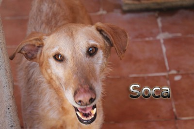 Soca ist ein sehr netter Hund, sehr souverän mit anderen Hunden, sehr lieb mit Freiwilligen und sehr ruhig im Allgemeinen.