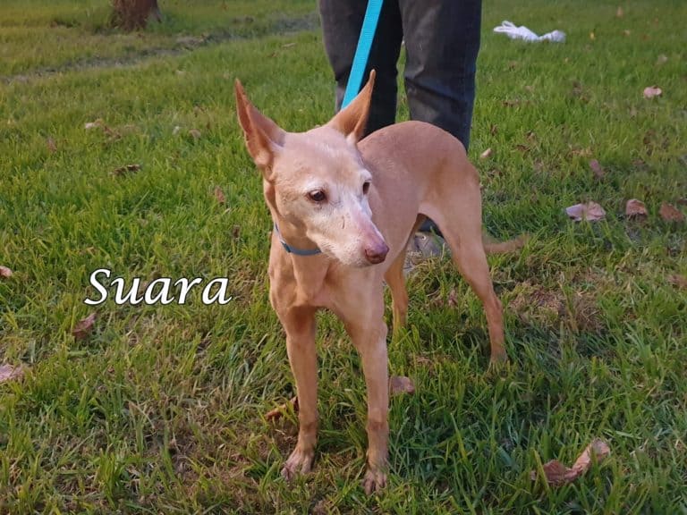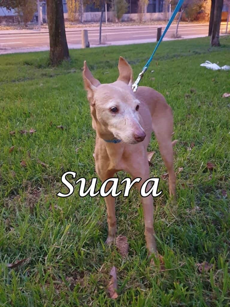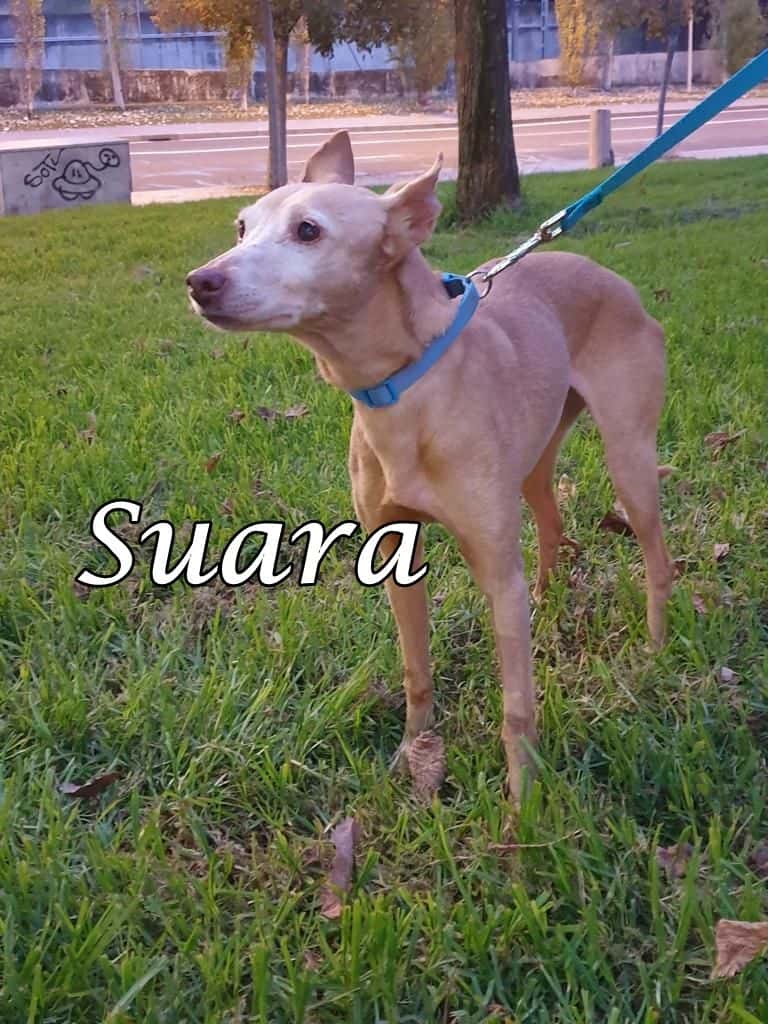 Suara wurde von einem jungen Pärchen gerettet, das in der städtischen Perrera einen älteren Hund adoptieren wollte. Während sie dabei waren, die bürokratischen Formalitäten zu erledigen, hörten sie wie in Jäger Suara in der Perrera abgeben wollte, damit sie dort getötet werden konnten.