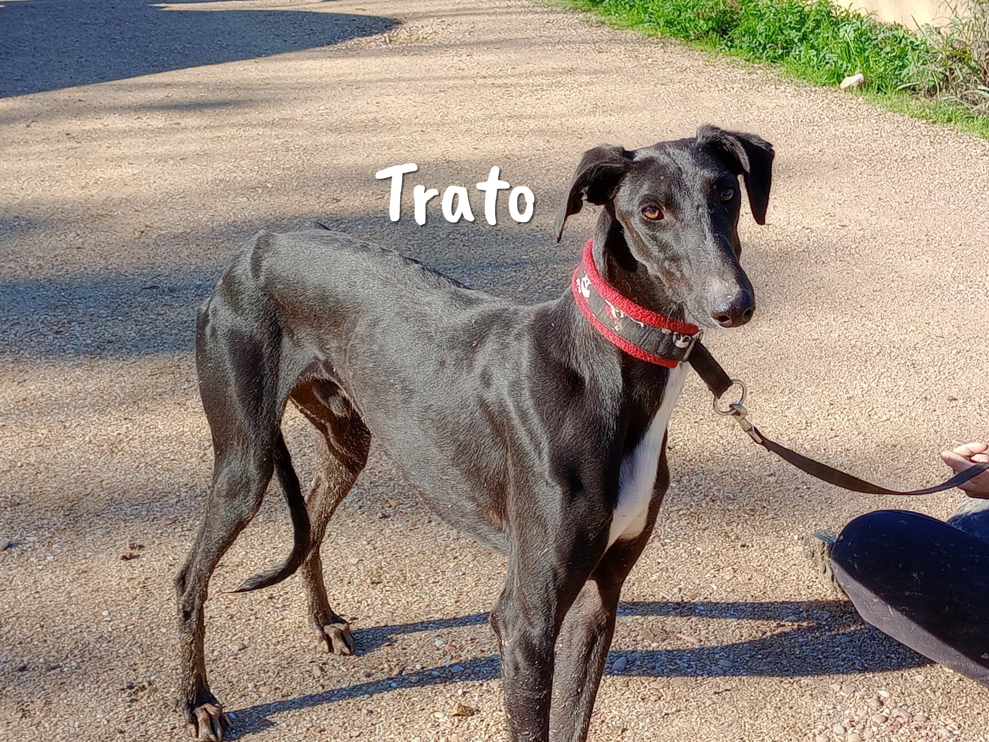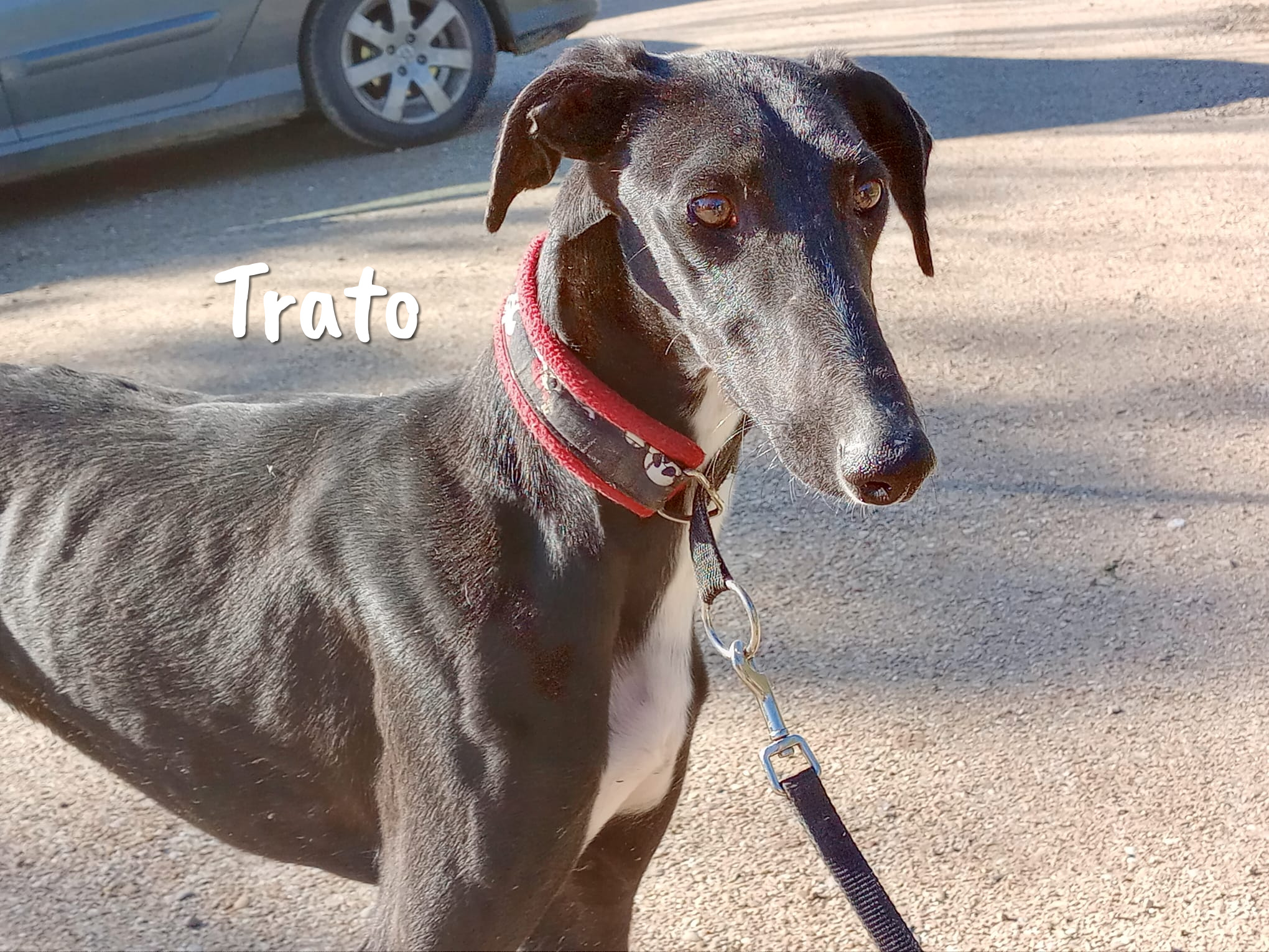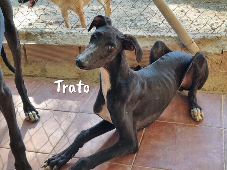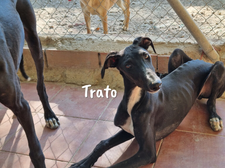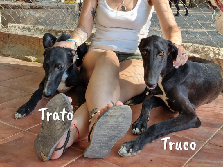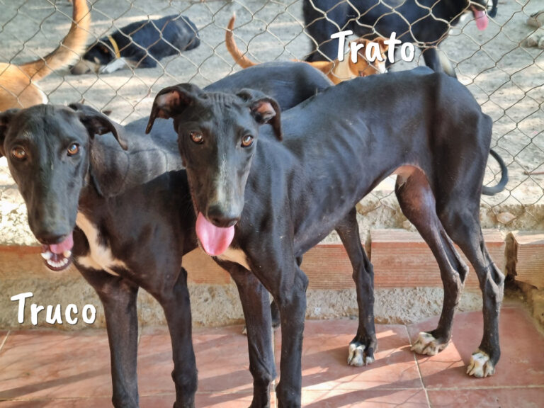 Truco und Trato gehörten einem 'Galguero', der seine Hunde in der Nähe vom Refugium hält. Er brachte die zwei vorbei, weil er einfach keine Lust auf sie hatte. Im Shelter sind die zwei jungen Brüder sehr verspielt und verschmust. Für diese zwei wunderschönen 'Riesenbabys' wünschen wir uns Galgoliebhaber, die Zeit und Lust haben, zwei junge Hunde zu erziehen und artgerecht auszulasten. Da sie im Shelter absolut verträglich sind, denken wir, dass sie sich auch mit einem vorhanden Ersthund sehr gut arrangieren würden.