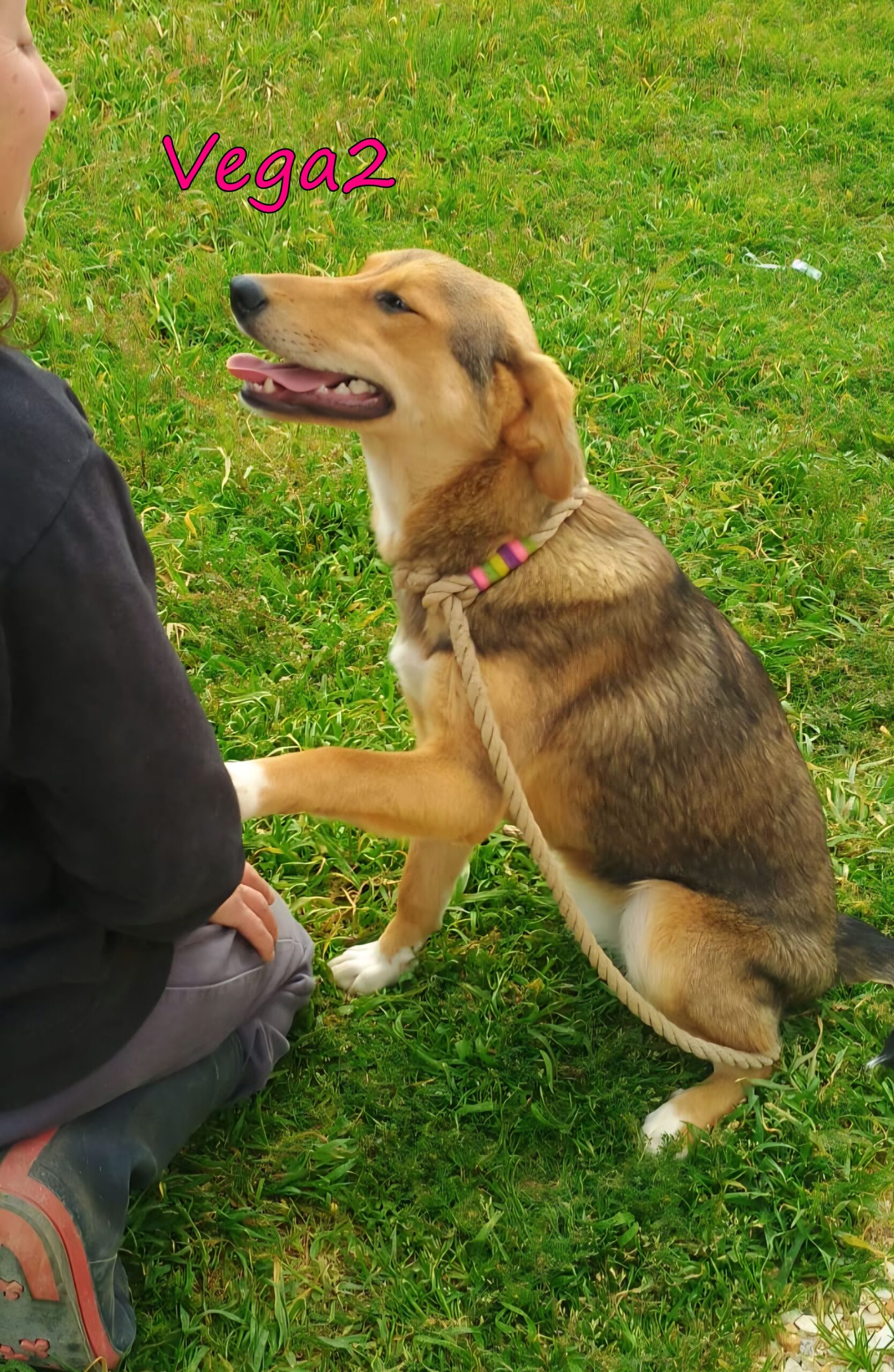 Vega2 ist eines ihrer Babys. Sie ist etwas schüchtern, aber wenn man ruhig mit ihr spricht und ihr Zeit gibt, fasst sie schnell Vertrauen. Sie ist jetzt ein fröhlicher, anhänglicher und lieber Welpe, der gerne mit den anderen Welpen im Tierheim spielt und herumtollt. Sie ist bereit, ihre Familie fürs Leben zu finden und die Wärme und Liebe eines Zuhauses zu genießen.